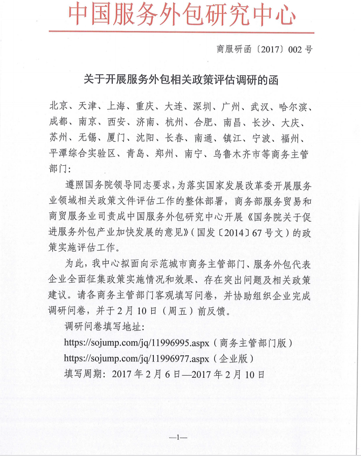 關(guān)于開展服務(wù)外包相關(guān)政策評估調(diào)研的函
